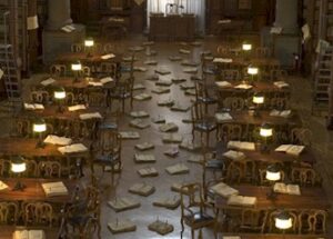 Ho seguito anche il dibattito tra Umberto Galimberti, il Cardinale Tonini e lo stesso Olmi. Il filosofo ricalca, nella sua arida e sicura analisi del film, il personaggio del superiore del professorino. Non che non dica cose anche giuste, ad esempio quando dice che nessuna religione può dire sinceramente di dialogare con le altre finché non nega il dogma di essere detentrice della verità, ma solo della sua verità. Ma il buon Galimberti è offeso, e si vede, dalla forte scena iniziale del film, quella della follia, in cui il professorino inchioda decine di libri antichi al pavimento e ai tavoli di legno dell’Antica Biblioteca Universitaria di Bologna, chiodi che non per nulla sono identici a quelli che si dovettero usare con Gesù Cristo sulla croce. Il simbolico parallelismo tra conoscenza e uso che si fa della stessa e Cristo e relativi insegnamenti ci sta tutto tutto…