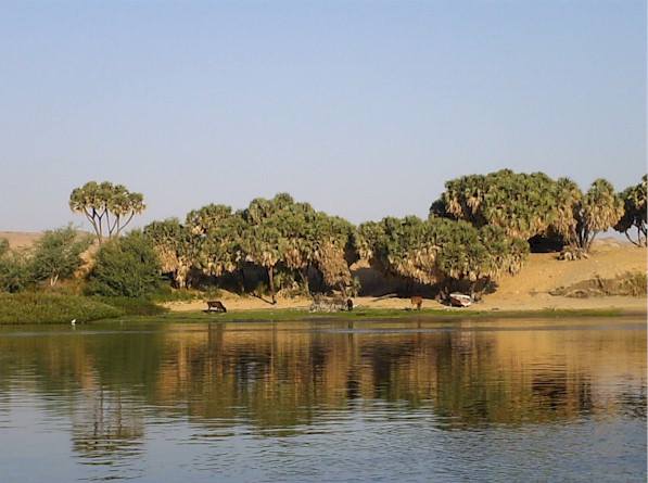 E noi si riprende “il dolce far niente” del giorno prima… Si osservano scene rurali di contadini al lavoro nei campi in – apparentemente – immacolate galabiya; pescatori all’opera (alcuni lavorano per una settimana di fila, dall’alba al tramonto, lasciando il pesce vivo in acqua, e dormendo rannicchiati stretti nelle loro barchette di notte); il solito traffico fluviale di innumerevoli altre feluche. Oltre a ciò, è un po’ come fare vita di mare: un po’ di sole, un po’ di letture, un po’ di chiacchiere, un tè, e due passi, ora in un palmeto, ora nelle sabbie del deserto… Si osserva, ci si rilassa e ci si abbronza… Ogni tanto il vento cambia direzione e ci porta folate roventi che odorano di deserto, un misto di sabbia e polvere. In mezzo ai colori brillanti della vegetazione e delle fioriture, sotto nuvole che a volte sembrano fare a gara nello specchiarsi nel blu intenso del fiume vicino a riva, dove è sempre placido, ci si dimentica che appena al di là ci sono solo dune e rocce aride per migliaia e migliaia di chilometri…