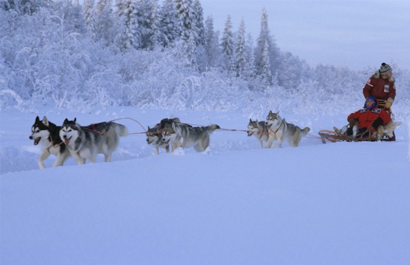 Villaggi e sobborghi residenziali con case di legno di betulla, bambini che giocano a hockey sulle strade interne e motoslitte parcheggiate a fianco delle auto, le batterie sempre collegate alle colonnine elettriche per impedire al freddo di scaricarle, si alternano a tratti di fitta foresta. A Kolari lasciamo la statale e il fiume ghiacciato, diretti al centro geografico della Lapponia Finlandese. Il benvenuto ufficiale ce lo dà una slitta coperta da pelli di renna trainata da husky. La comparsa sul lato della strada dell’icona dell’avventura artica segnala più che bene il cambio di mondo a circa 150 chilometri e 3 ore abbondanti di autobus a nord est di Tornio.